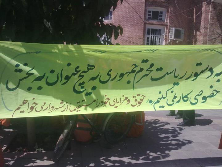 کارگران در این تجمع اعتراضی اعلام کردند: «به دستور ریاست محترم جمهوری به هیچ عنوان برای بخش خصوصی کار نمیکنیم. حقوق و مزایای خود را مستقیما از شهرداری میخواهیم.»